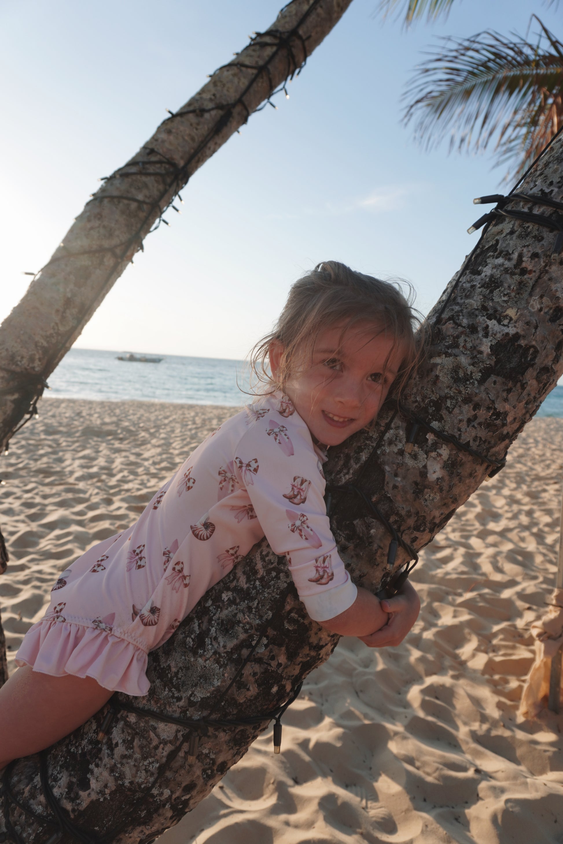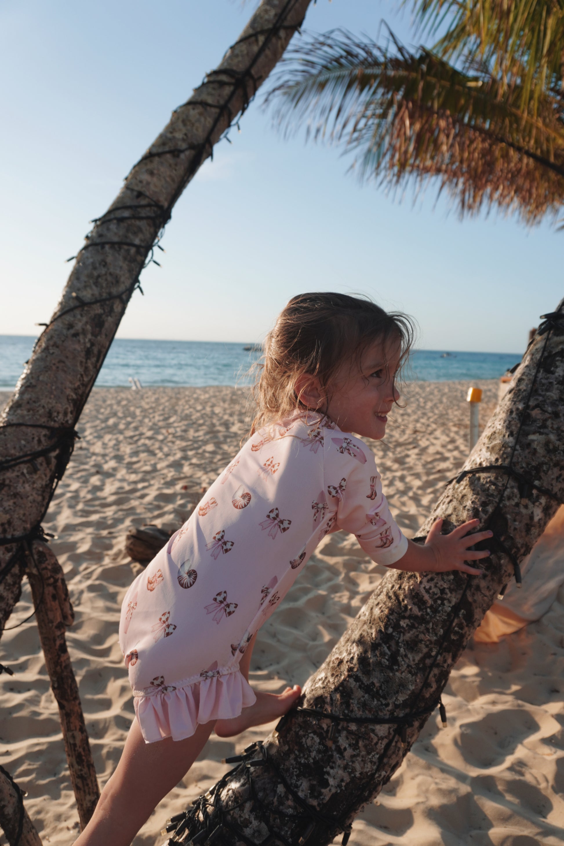 Let your little one saddle up for sunny adventures in this long sleeve coastal cowgirl swimsuit — perfect for splashing in the waves or playing under the sun. Designed with our signature western-meets-beach print featuring nautilus shell, cowgirl boots, cow print bow, and pink surfboard, it’s the perfect coastal cowgirl blend.